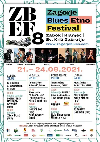 Ovogodišnji 8. Zagorje Blues Etno Festival održat će se od 21. do 24. kolovoza. Programi će se realizirati na otvorenom u Zaboku, Klanjcu i Svetom Križu Začretju. Uz domaće izvođače, Gordanu Kovačić, Zacka Dusta, Miru Dimića, Bok Blues, projekt GIIPUJA i Tomislava Golubana, na festivalu će zasvirati i inozemni izvođači, talijanski Mike Sponza Band i kalifornijski duet Kelly's Lot koji u Lijepu našu dolaze po prvi put. Kao i proteklih godina, osim koncerata, organizator nudi i razne edukativne programe.
