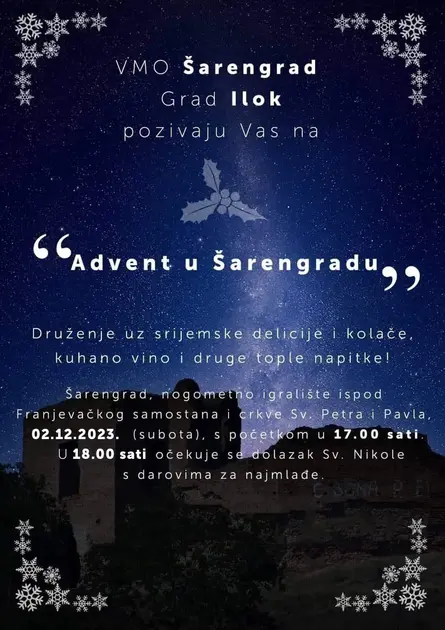 Advent u Šarengradu počinje 2. prosinca s početkom u 17 sati na nogometnom igralištu ispod Franjevačkog samostana i crkve Sv.Petra i Pavla, a bit će organizirano druženje uz srijemske delicije i kolače, kuhano vino i druge tople napitke. U 18 sati očekuje se dolazak sv. Nikole s poklonima za najmlađe.