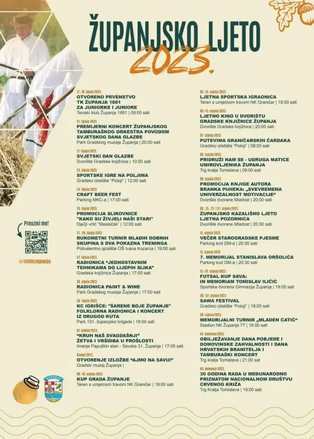 Ljeto je u punom jeku, tko može odmara se na moru, tko još nije na Jadranu uživa u svojem kraju. U Županji su se pobrinuli svima koji ostaju kod kuće osigurati kvalitetne sadržaje koji će ih zabaviti, osvježiti i razonoditi tijekom vrućih ljetnih dana i noći u Cvelferiji. Program Županjskog ljeta 2023 počeo je još krajem proljeća 17. lipnja a traje do 4. kolovoza.