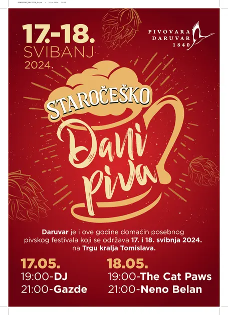 I ove godine nastavlja se tradicija održavanja Dana Piva u najljepšem malom gradu kontinentalne Hrvatske. Staročeško Dani Piva održat će se 17. i 18. svibnja 2024. godine na trgu kralja Tomislava.