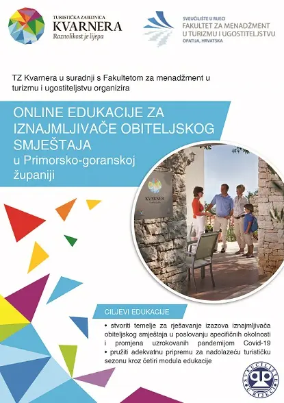 Turistička zajednica Kvarnera tijekom travnja održava online edukacije za iznajmljivače koje su besplatne za sve sudionike. Cilj edukacije je stvoriti temelje za rješavanje izazova iznajmljivača obiteljskog smještaja u poslovanju specifičnih okolnosti i promjena uzrokovanih pandemijom COVID-19, te pružiti adekvatnu pripremu za nadolazeću turističku sezonu kroz zanimljiv i dinamičan program aktualne tematike.