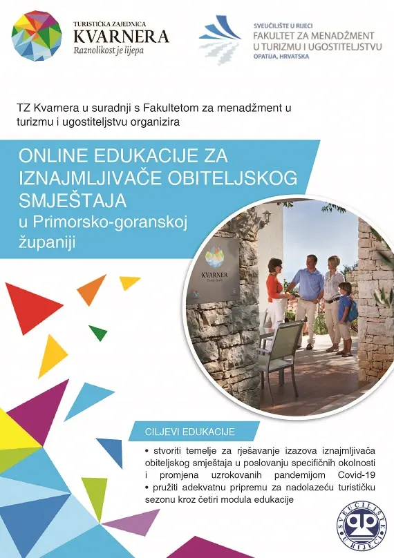 Turistička zajednica Kvarnera tijekom travnja nastavlja održavati niz besplatnih online edukacija za iznajmljivače. Cilj edukacija je pomoći i usmjeriti iznajmljivače u njihovom poslovanju u okolnostima pandemije te im pružiti adekvatnu pripremu i informacije za nadolazeću turističku sezonu.